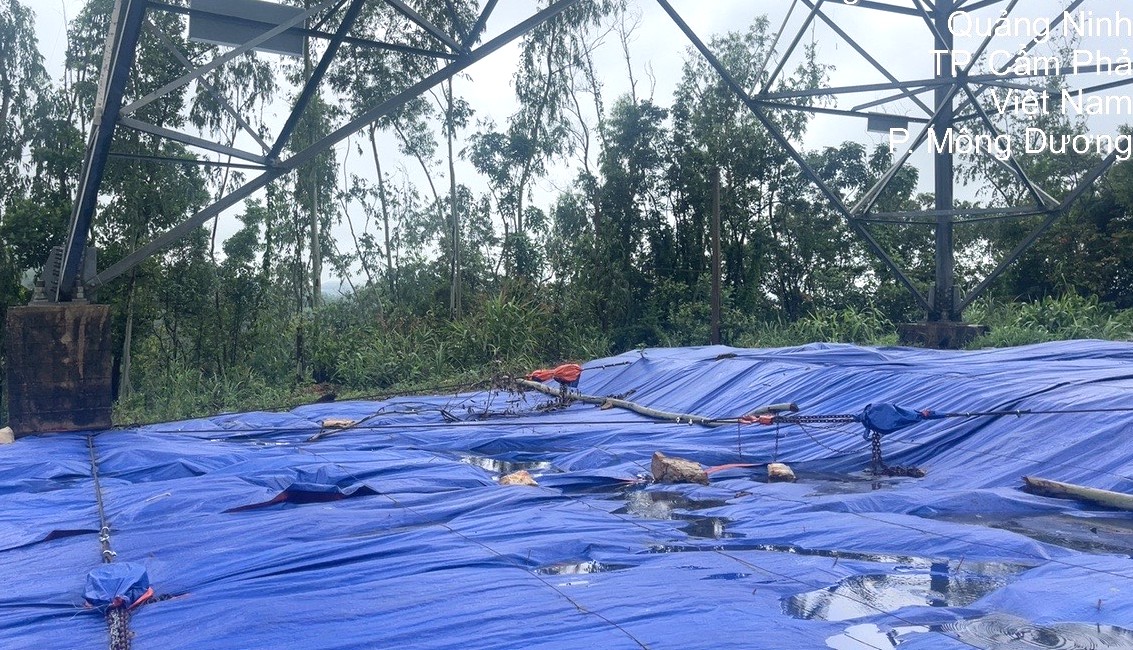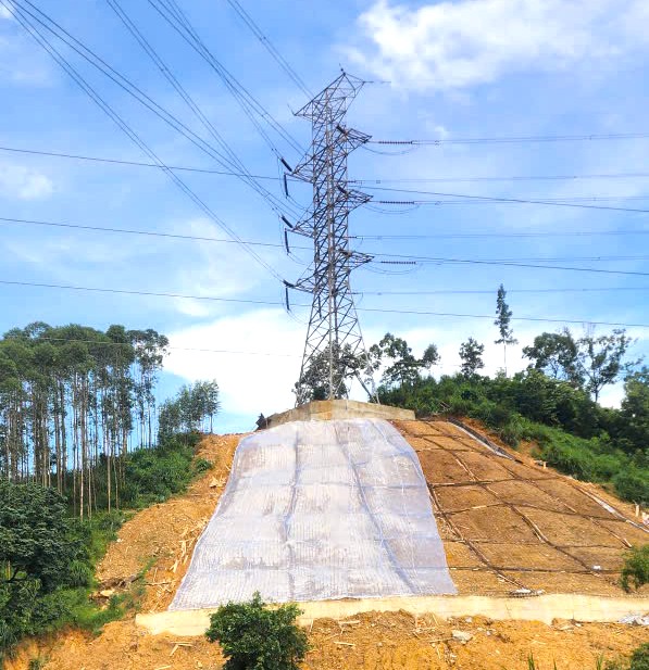 Đội Truyền tải điện Đông Bắc 1 căng phủ bạt để chống sạt trượt tại những vị trí cột có nguy cơ sạt trượt