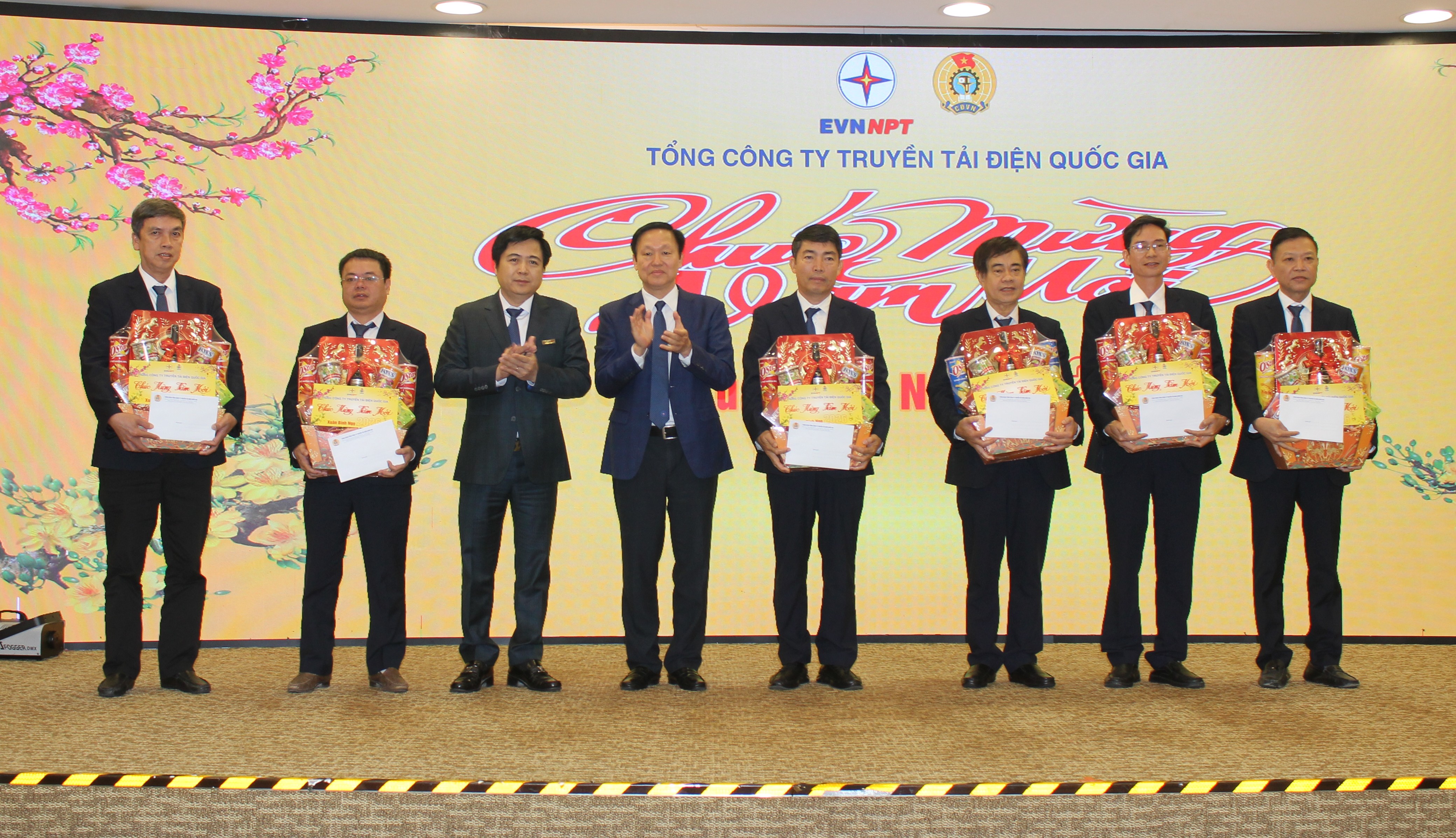 Ông Trương Hữu Thành - Phó Bí thư Đảng ủy , Quyền Tổng giám đốc EVNNPT và ông Trịnh Tuấn Sơn – Nguyên Chủ tịch Công đoàn EVNNPT trao quà chú tết Bính Ngọ - 2026.