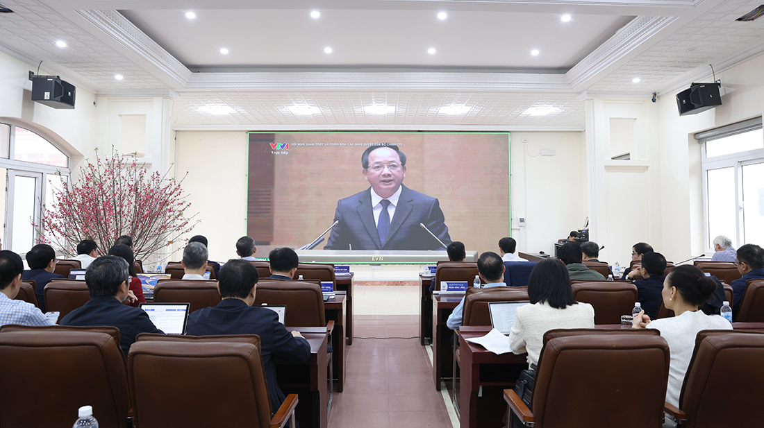 Các đồng chí tại điểm cầu Đảng ủy EVNNPT nghe đồng chí Trịnh Văn Quyết - Ủy viên Bộ Chính trị, Bí thư Trung ương Đảng, Trưởng ban Tuyên giáo và Dân vận Trung ương thông tin chuyên đề "Nội dung trọng tâm, cốt lõi của Nghị quyết số 80-NQ/TW ngày 7/1/2026 của Bộ Chính trị về phát triển văn hóa Việt Nam"