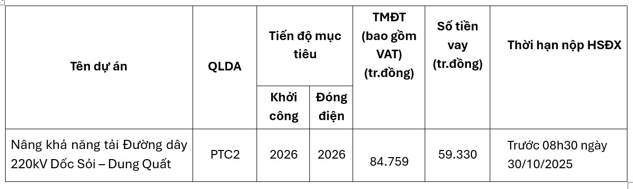 EVNNPT đang có nhu cầu thu xếp vốn cho dự án Nâng khả năng tải đường dây 220kV Dốc Sỏi – Dung Quất theo hình thức chào cạnh tranh, cụ thể như sau:
