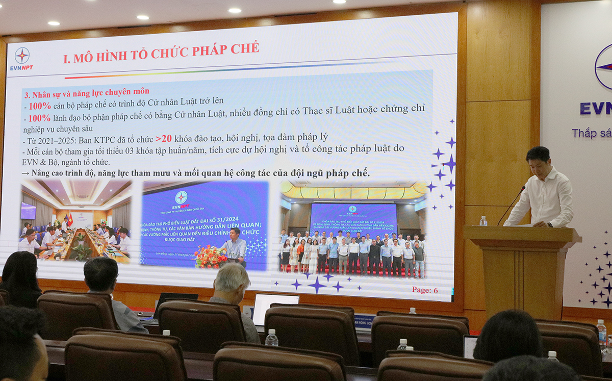 Để đáp ứng yêu cầu phát triển, đề nghị Ban Kiểm tra, Thanh tra và Pháp chế và bộ phận pháp chế trong Tổng công ty tiếp tục phát huy xây dựng đội ngũ pháp chế chuyên nghiệp và hội nhập, tăng cường đào tạo chuyên sâu về đầu tư, đấu thầu, hợp đồng, tranh chấp và pháp luật quốc tế. Tăng cường vai trò pháp chế trong mọi hoạt động của Tổng công ty, đảm bảo được tham gia từ giai đoạn đầu của các dự án. Nghiên cứu Ứng dụng mạnh mẽ công nghệ và trí tuệ nhân tạo (AI) trong tra cứu, thẩm định và dự báo rủi ro pháp lý. Phát triển văn hóa tuân thủ trong toàn EVNNPT, để mỗi cán bộ, người lao động coi tuân thủ không chỉ là nghĩa vụ mà còn là niềm tự hào và giá trị văn hóa doanh nghiệp.