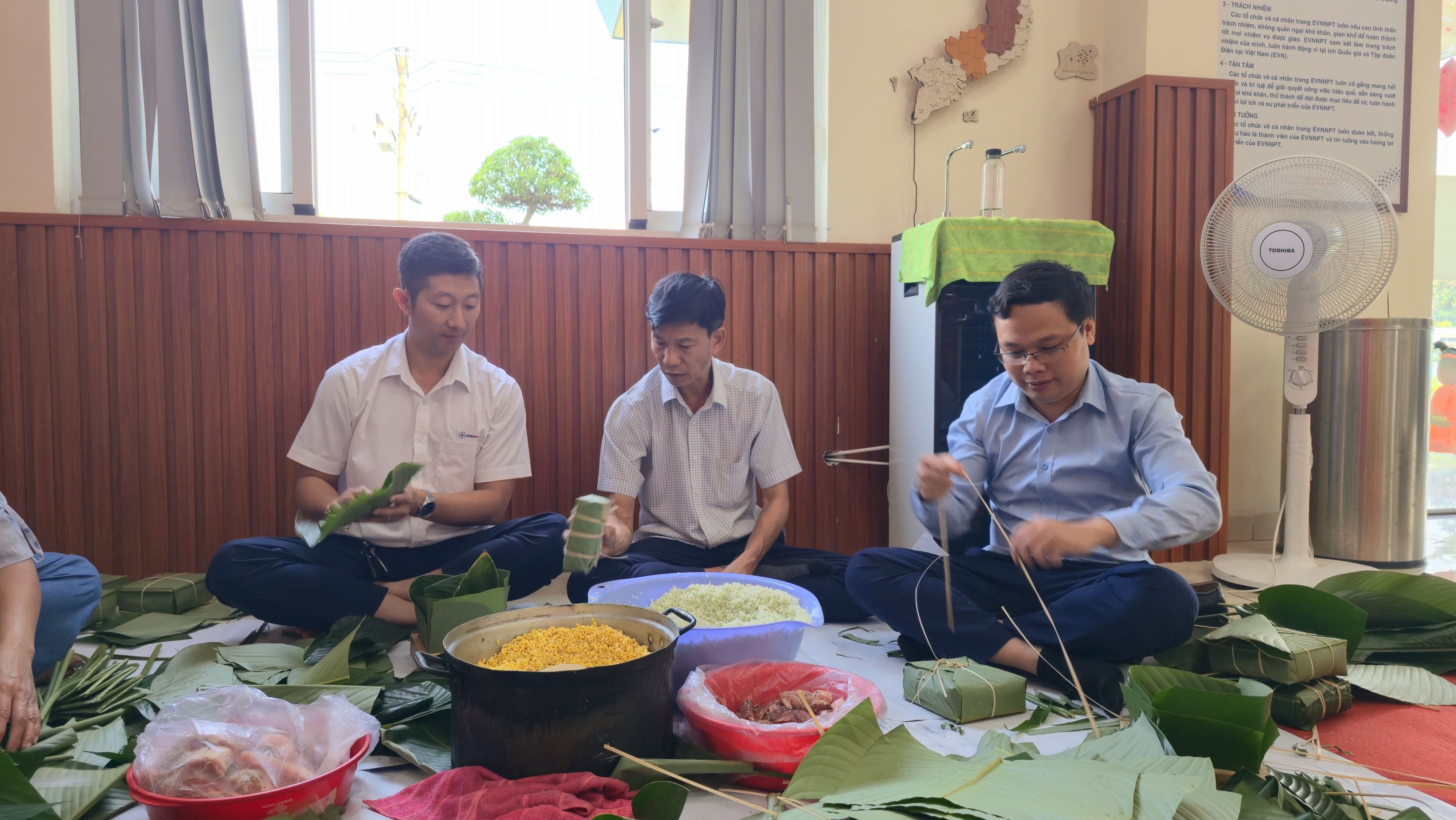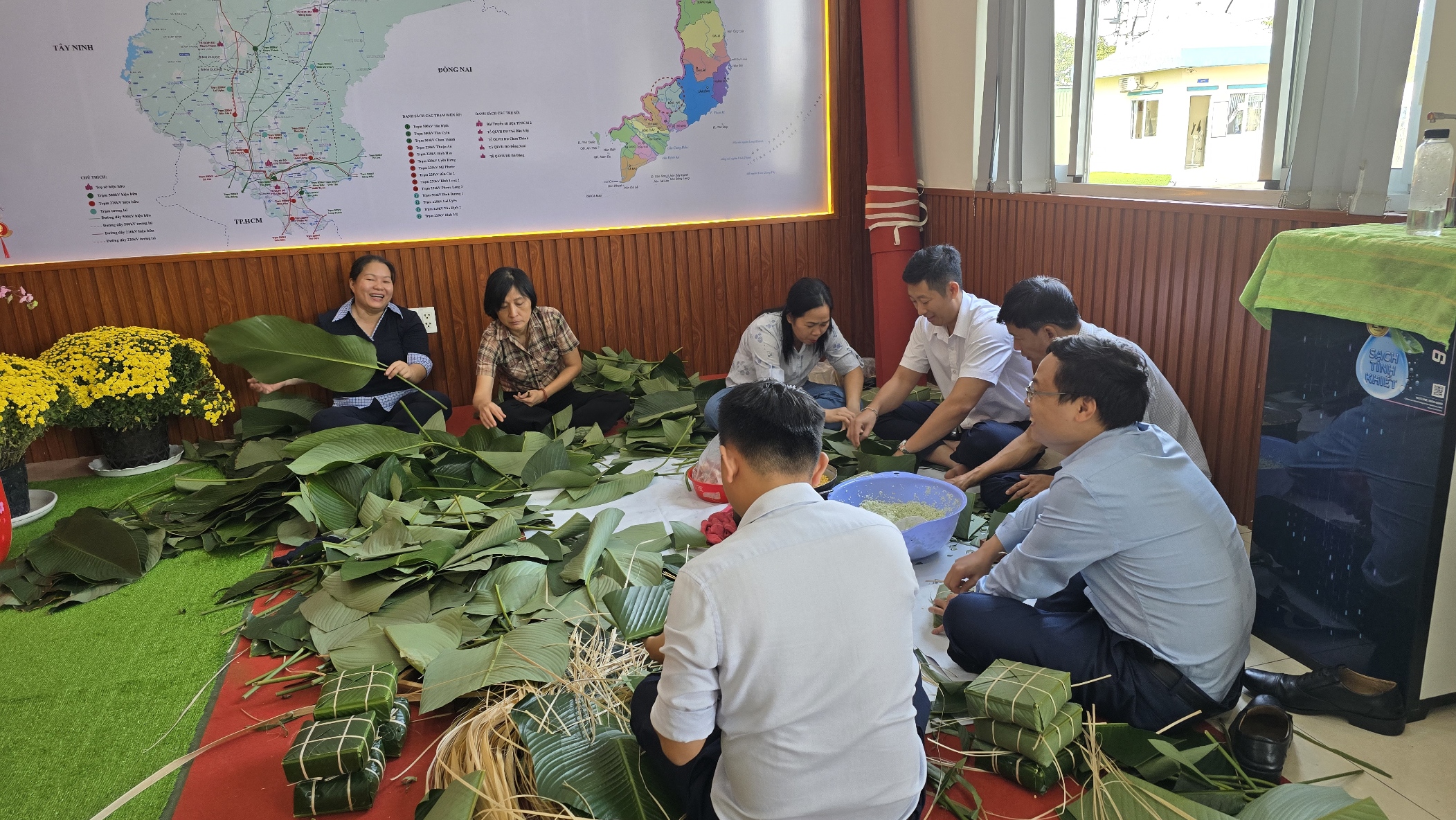 Cán bộ, công nhân viên Công đoàn Cơ quan Truyền tải điện Thành phố Hồ Chí Minh 2 cùng nhau gói bánh chưng trong không khí rộn ràng, ấm áp tại trụ sở Đội.