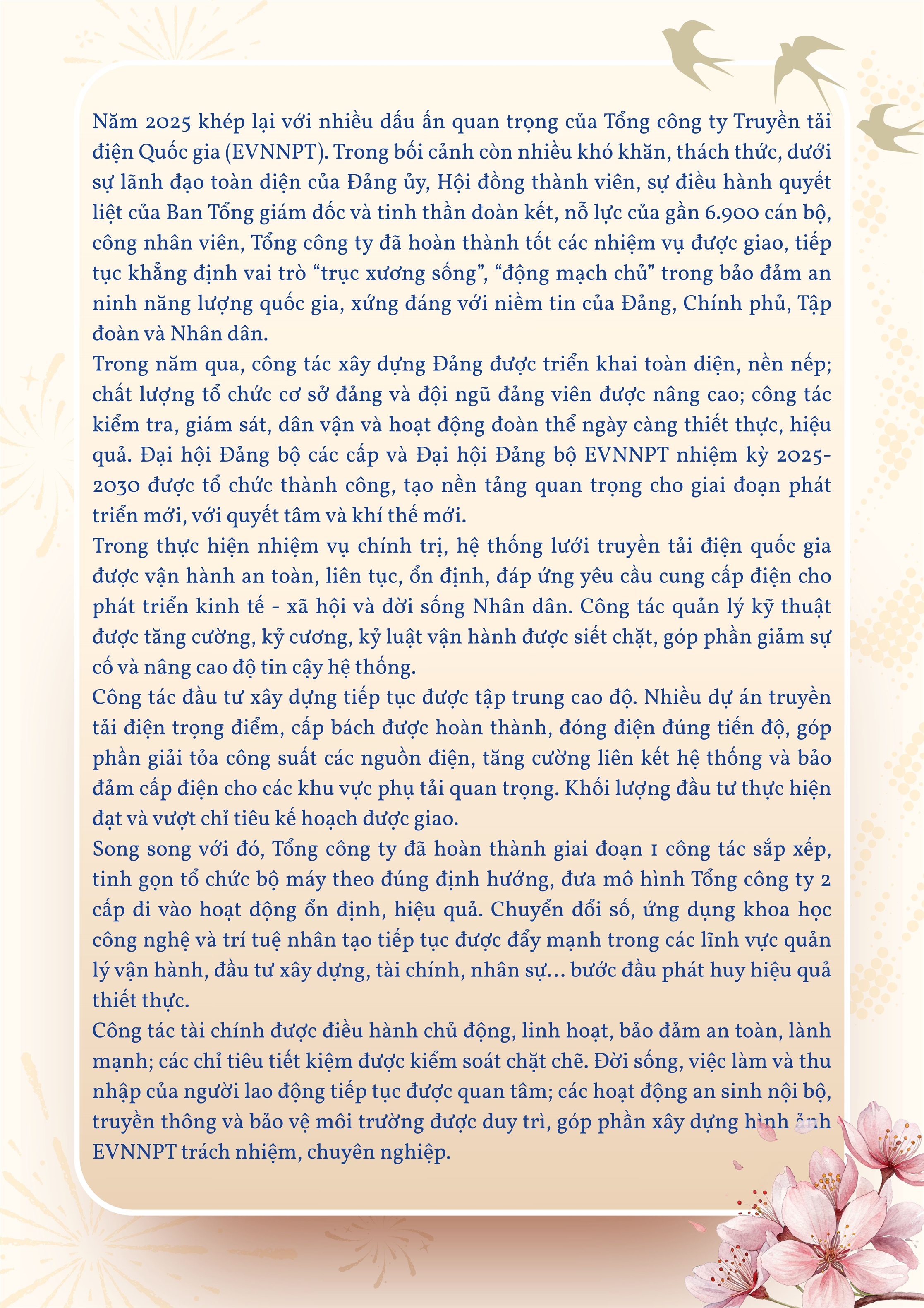 Nhân dịp Xuân mới 2026 và Tết cổ truyền Bính Ngọ, Bí thư Đảng ủy, Chủ tịch HĐTV EVNNPT kính chúc toàn thể cán bộ, công nhân viên và gia đình sức khỏe, hạnh phúc, thành công.