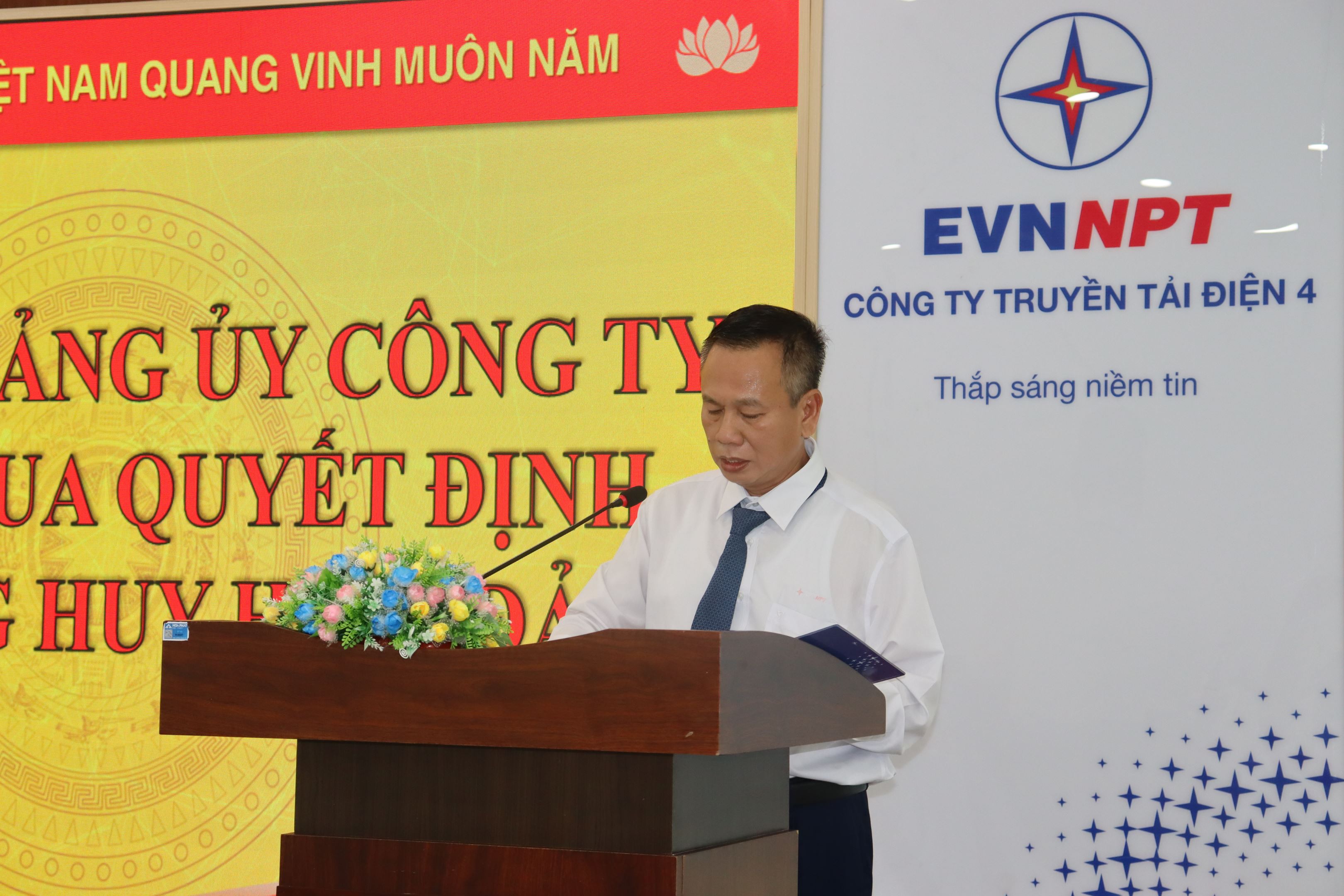 Phát biểu tại buổi lễ, đồng chí Võ Đình Thủy – Bí thư Đảng ủy, Giám đốc Công ty Truyền tải điện 4 ghi nhận quá trình rèn luyện, cống hiến của đồng chí Nguyễn Phụng Long đối với sự phát triển chung của Công ty, đồng thời mong muốn đồng chí tiếp tục phát huy tinh thần trách nhiệm, là tấm gương sáng trong xây dựng Chi bộ và Đảng bộ Công ty ngày càng lớn mạnh.